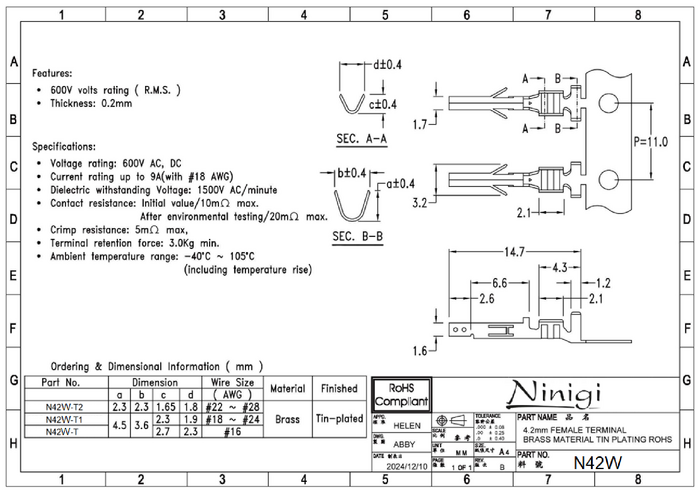 Terminal żeński; Mini-Fit Jr.; styk; mosiądz; cynowany; 9A; 0,2-0,32mm2; 24AWG...22AWG; zaciskanie; = MX-5556...; N42W-T2; NINIGI; RoHS; opakowanie/100szt