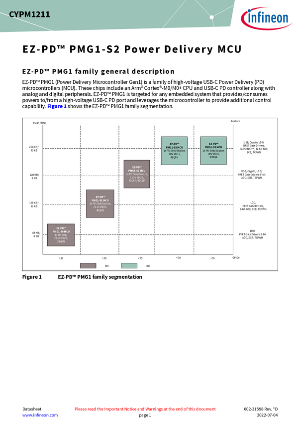 Dual Role Port USB-C PD with USB Full-Speed device, including moist detection EZ-PDTM PMG1-S2 CYPM1211-40LQXI is the tray packing type option of the PMG1-S2, it supports Dual Role Port (DRP) USB-C PD applications and integrates a USB full-speed device controller.