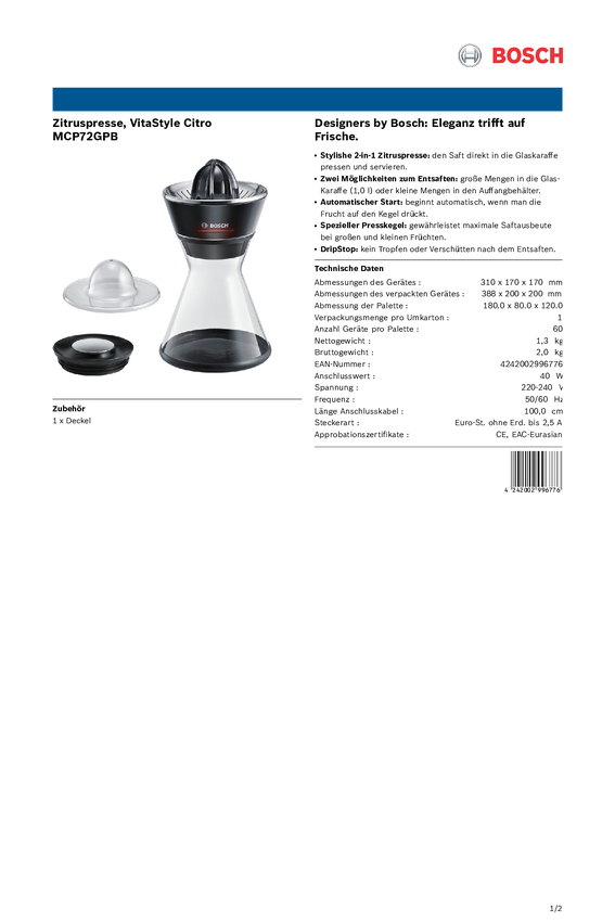 Bosch Haushalt Wyciskarka do cytrusów MCP72GPB 40 W czarny, stali szlachetnej
