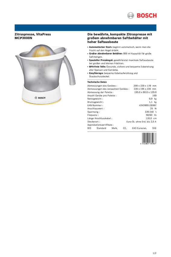Bosch Haushalt Wyciskarka do cytrusów MCP3000N 25 W biały