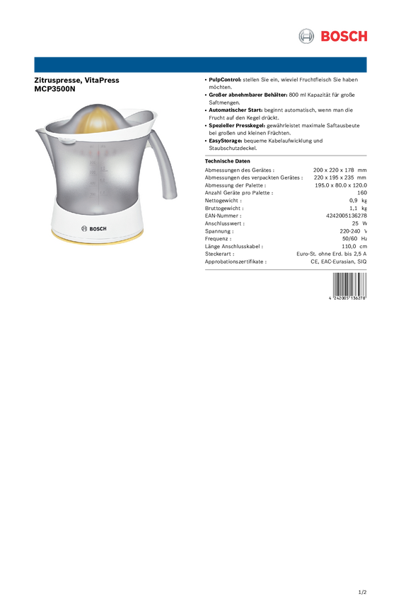 Bosch Haushalt Wyciskarka do cytrusów MCP3500N 25 W biały