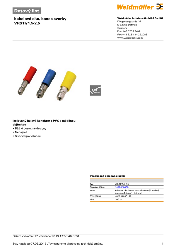 Weidmüller 1492050000 Tulejka okrągła 1.5 mm² 2.5 mm² Izolowane częściowo niebieski 100 szt.