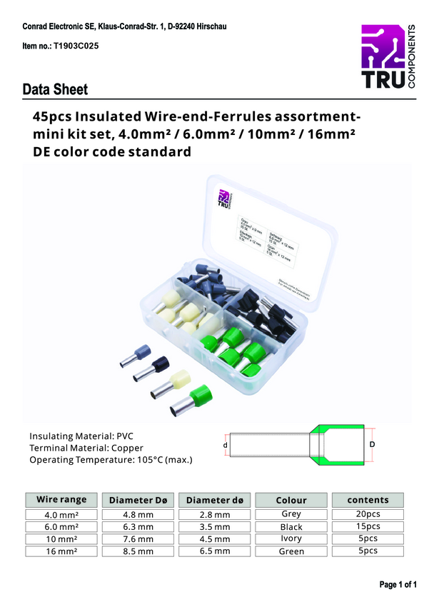 Końcówka rurkowa zestaw TRU COMPONENTS T1903C025 4 mm², 6 mm², 10 mm², 16 mm² Izolowane częściowo szary, czarny, żółty,