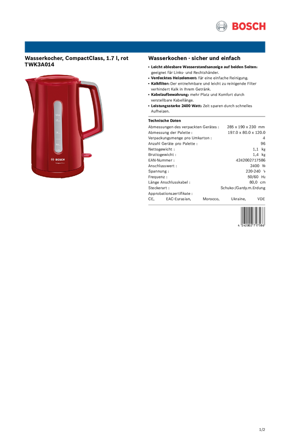 Bosch Haushalt TWK3A014 Czajnik czerwony Pojemność: 1.7 l