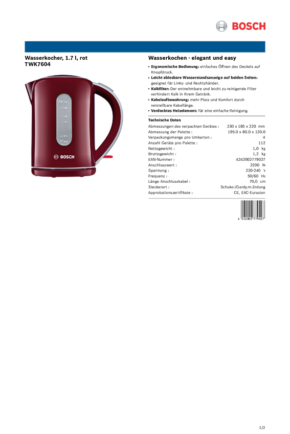 Bosch Haushalt TWK7604 Czajnik czerwony Pojemność: 1.7 l