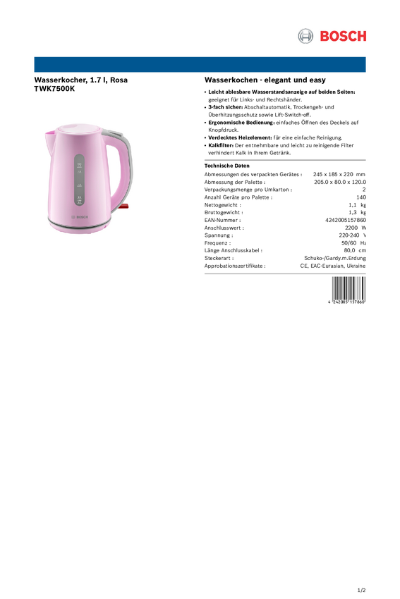 Bosch Haushalt TWK7500K Czajnik różowy Pojemność: 1.7 l