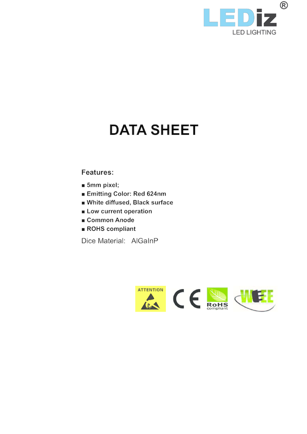 Matryca LED czerwona, jasna, 1.3" (32x32mm), 8x8, szare tło, dyfuzyjna, wspólna anoda