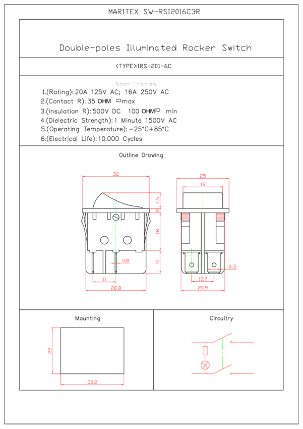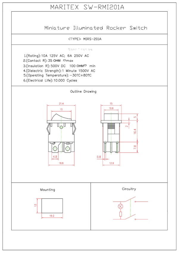 Miniaturowy przełączniki Rocker, 1-biegowy, dwustabilny OFF-ON, podświetlany, klawisz czerwony, 6A 250V AC