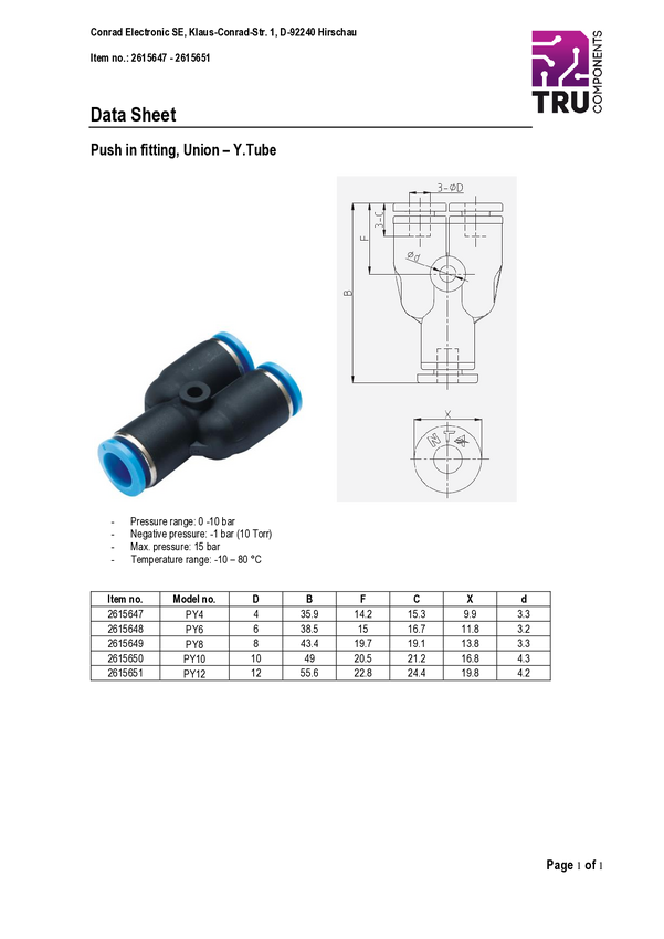 TRU COMPONENTS Złączka Y PY4 Średnica rury: 4 mm 1 szt.