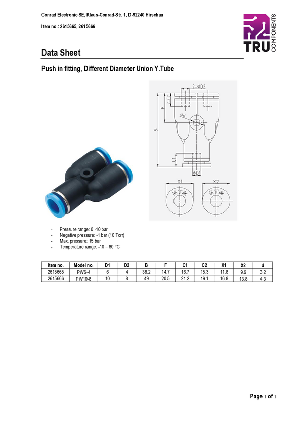 TRU COMPONENTS Złączka Y PW6-4 Średnica rury: 6 mm, 4 mm 1 szt.