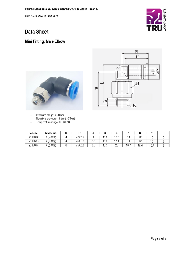 TRU COMPONENTS Złączka kątowa PL4-M3C Średnica rury: 4 mm Rozmiar gwintu: M3 x 0.50 1 szt.