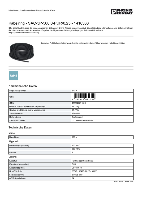 Phoenix Contact 1501692 Przewód czujnikowy Li9Y11Y-HF 4 x 0.25 mm² czarny, szary 100 m