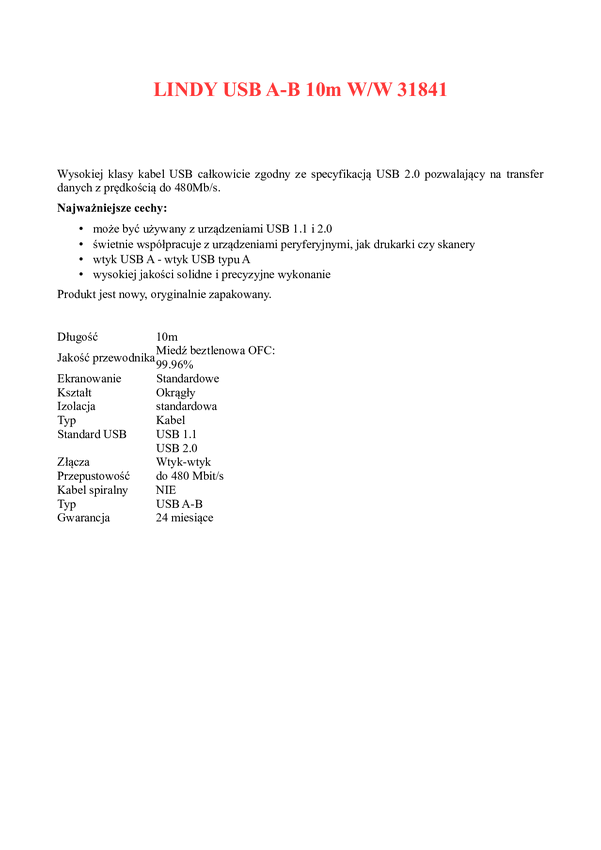 Lindy kabel USB A-B, 2.0, wtyk/wtyk, długość 10m, czarny, 31841