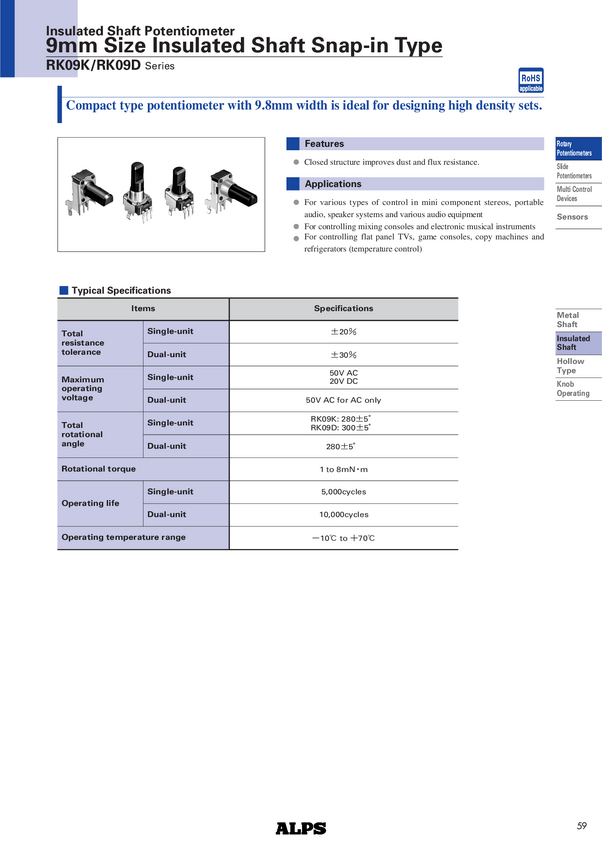 Potencjometr mono leżący 15mm, rezystancja 50 kohm; charakterystyka 1 B - liniowa Ośka plastykowa 6mm ścięta długość 25 mm Alps podaje dł.ośki jako LM i dł.definiowna jest w katalogu