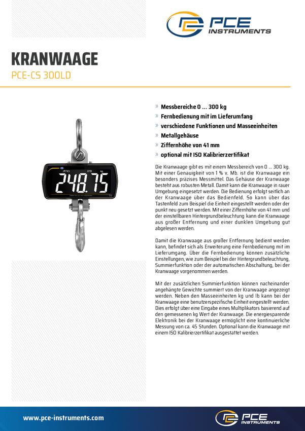 PCE Instruments Waga dźwigowa Zakres pomiaru maks. 300 kg bateryjne czarny