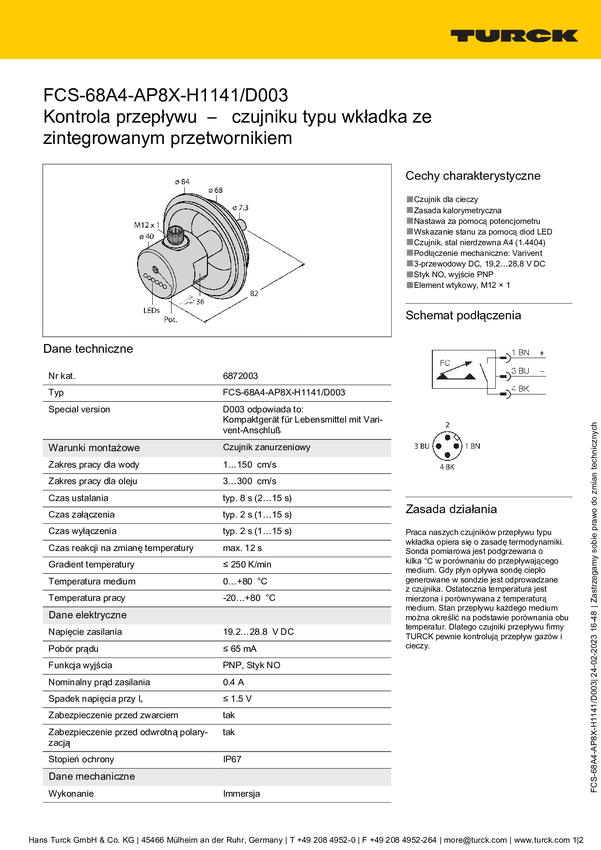 Turck Czujnik zanurzeniowy FCS-68A4-NA/D003 6872044 1 szt.