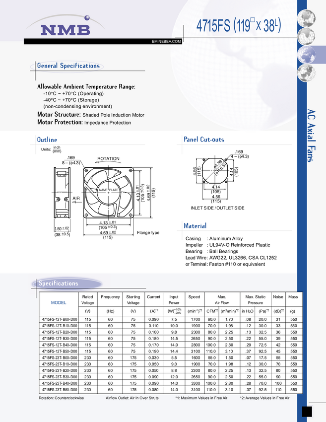 wentylator 120x120x38 mm 115 V AC, 60 Hz łożysko kulkowe 45 dBA 3,1m3 / min; I=0,19A; 14,4 W; 3100 RPM