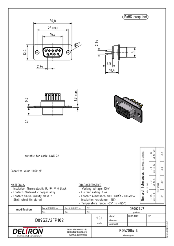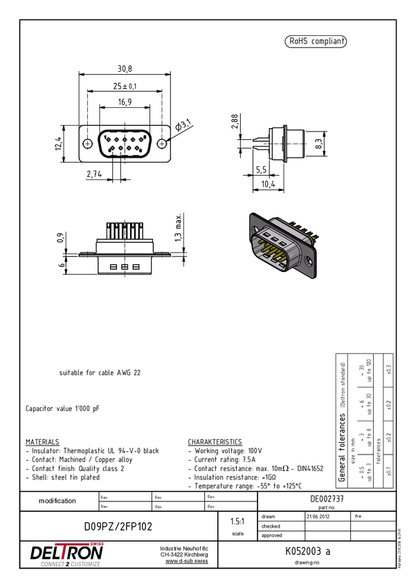 Deltron Connectors D09PZ/2FP102 Złącze męskie D-Sub, rzędy: 2, styki: 9, 180 °, 1 szt.