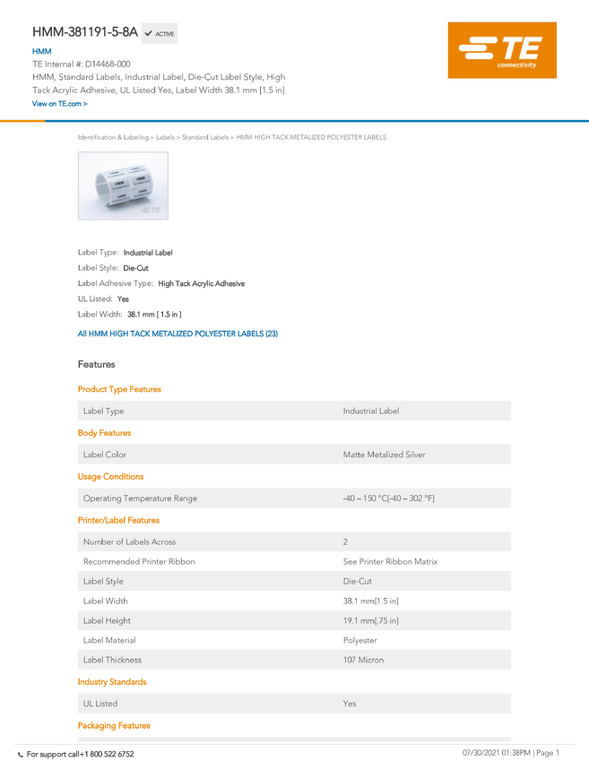 TE Connectivity D14468-000 TE RAY Labels - Standard