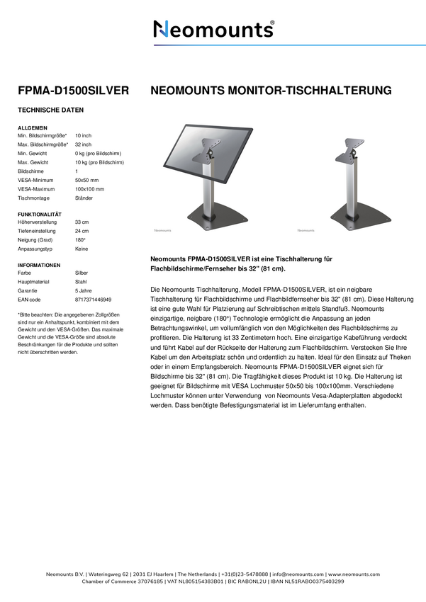 Neomounts FPMA-D1500SILVER Stojak na monitor do 1 ekranu - 10-32" - 0-10 kg - VESA 50x50-100x100 - Odłączany - Srebrny