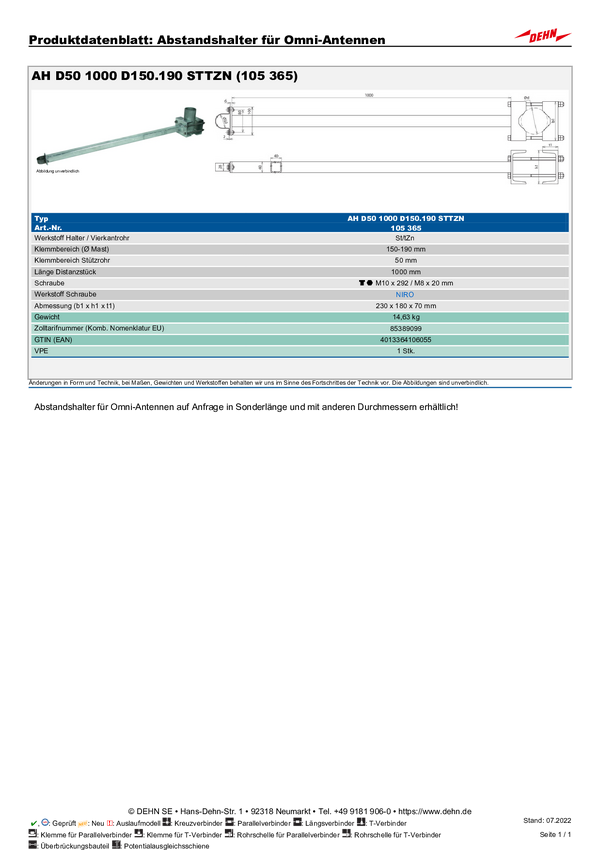 DEHN 105365 AH D50 1000 D150.190 STTZN Podkładka dystansowa 1 szt.