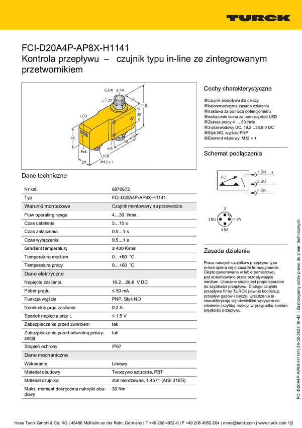 Turck 6870672 Czujnik liniowy FCI-D20A4P-AP8X-H1141, 19.2 - 28.8 V/DC, 1 szt.