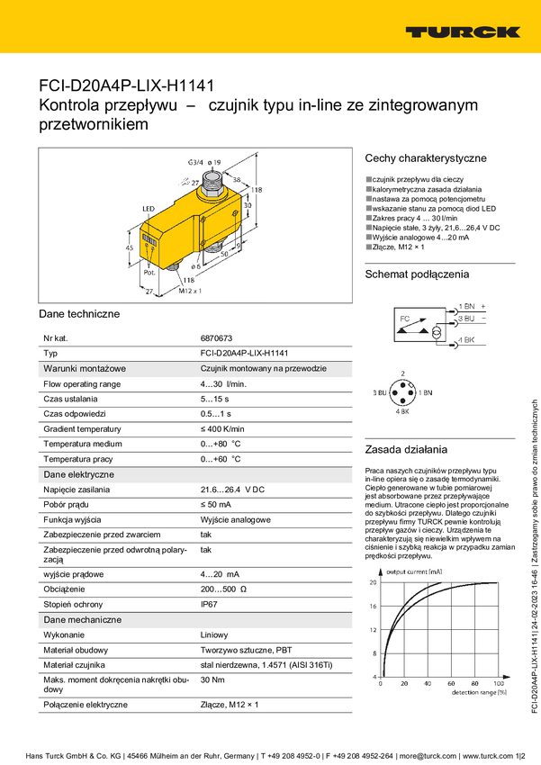 Turck 6870673 Czujnik liniowy FCI-D20A4P-LIX-H1141, 21.6 - 26.4 V/DC, 1 szt.