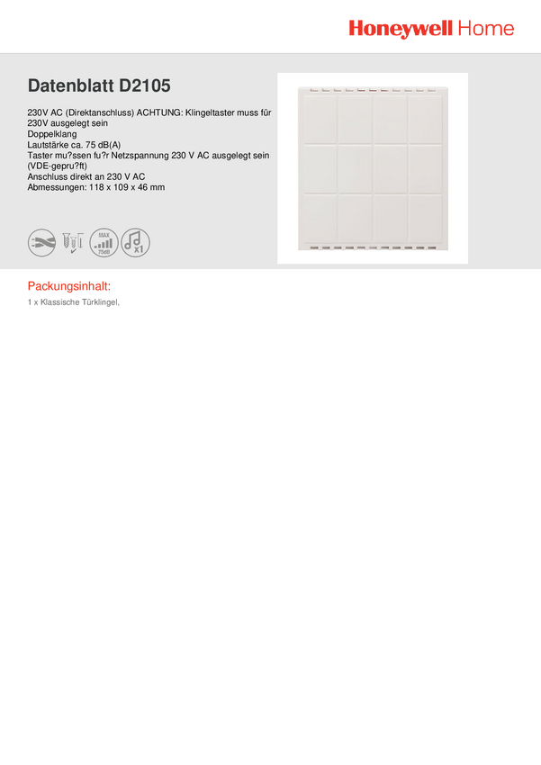 Mechanizm dzwonkowy Honeywell D2105, 75 dBA, 110 - 230 V