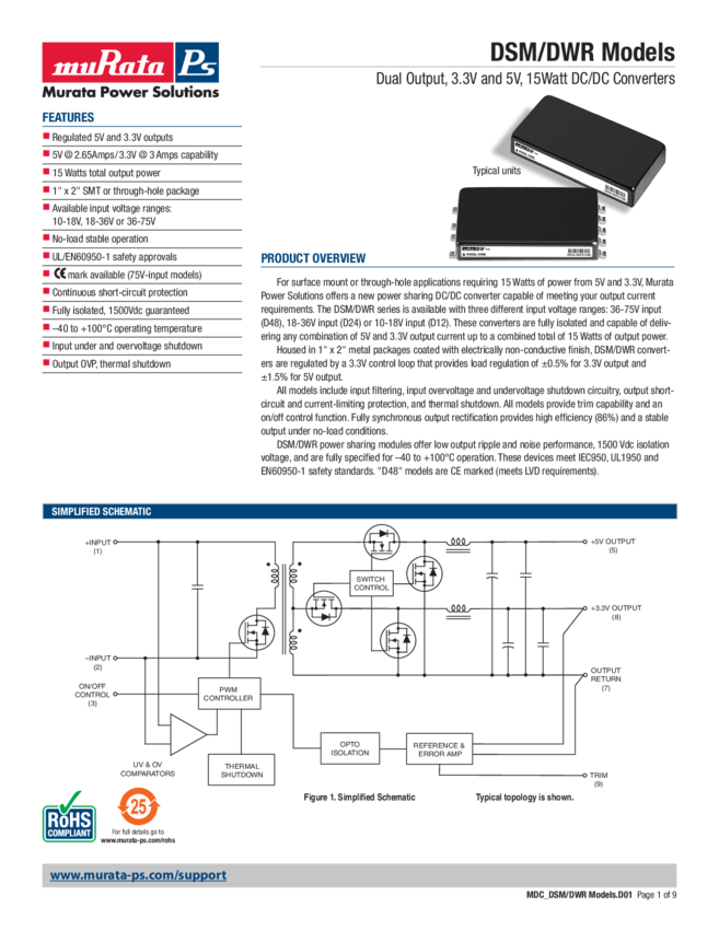Module DC-DC 2-OUT 3.3V/5V 2.65A/3A 15W 9-Pin Case C-18A