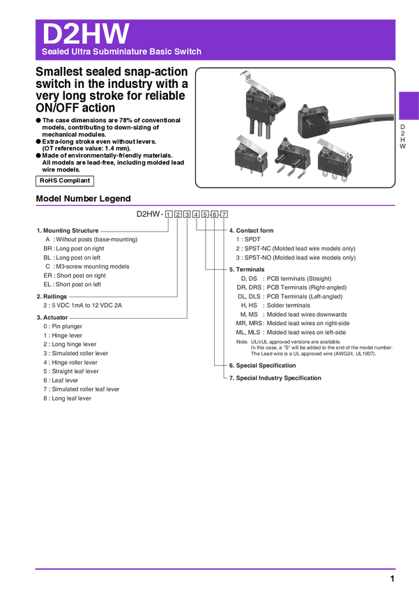 Mikroprzełącznik; bez dźwigni; SPDT; 0,1A/125VAC; 2A/12VDC; IP67; kątowy; lewy; OMRON; D2HW-BL201DL; RoHS