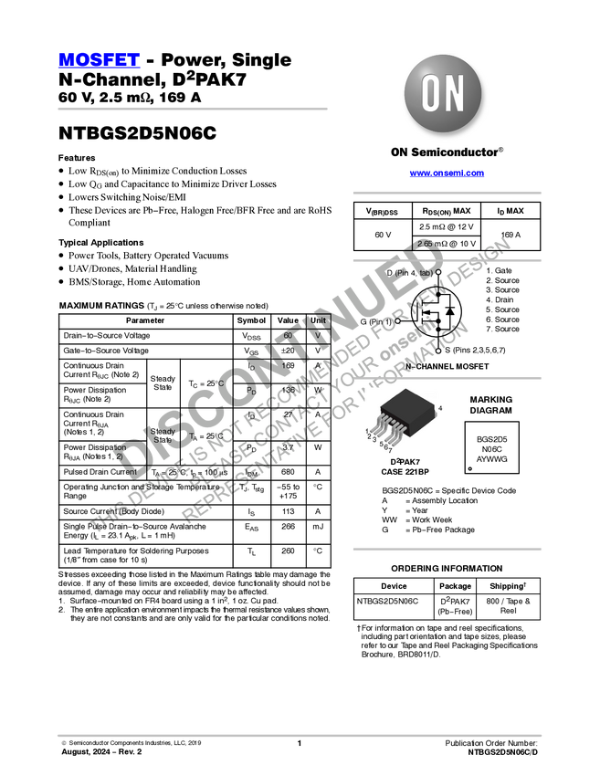 Power MOSFET, 60 V, 2.5 mΩ, 224 A, Single N−Channel, D2PAK7