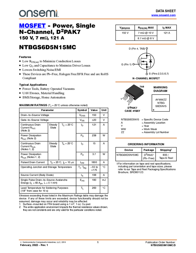 MOSFET - Power, Single N-Channel, D2PAK7 150 V, 7 mΩ, 121 A