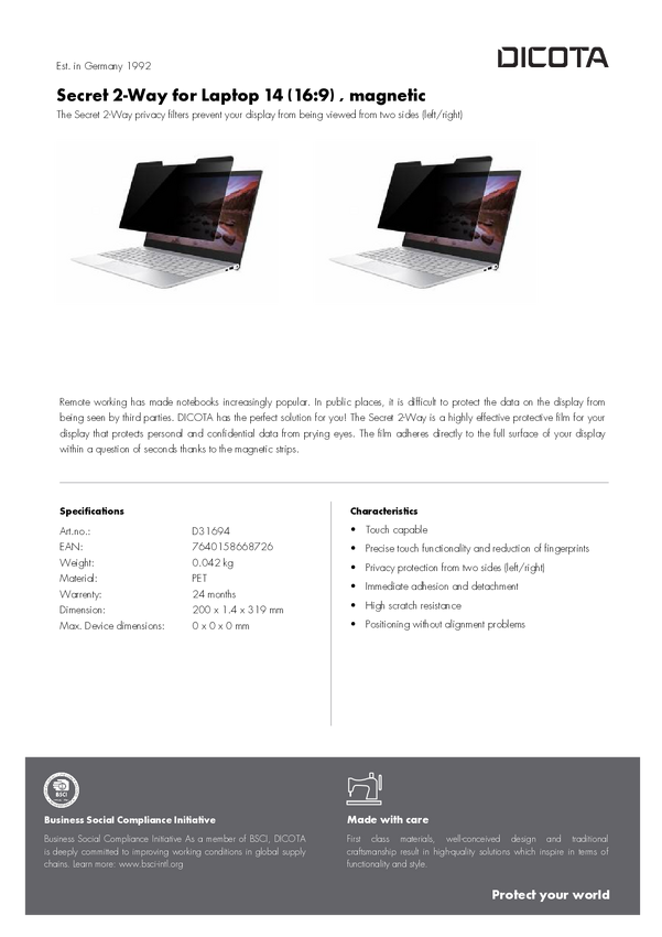 Filtr prywatyzujący Dicota D31694 do notebooków 35,6 cm (14 cali)