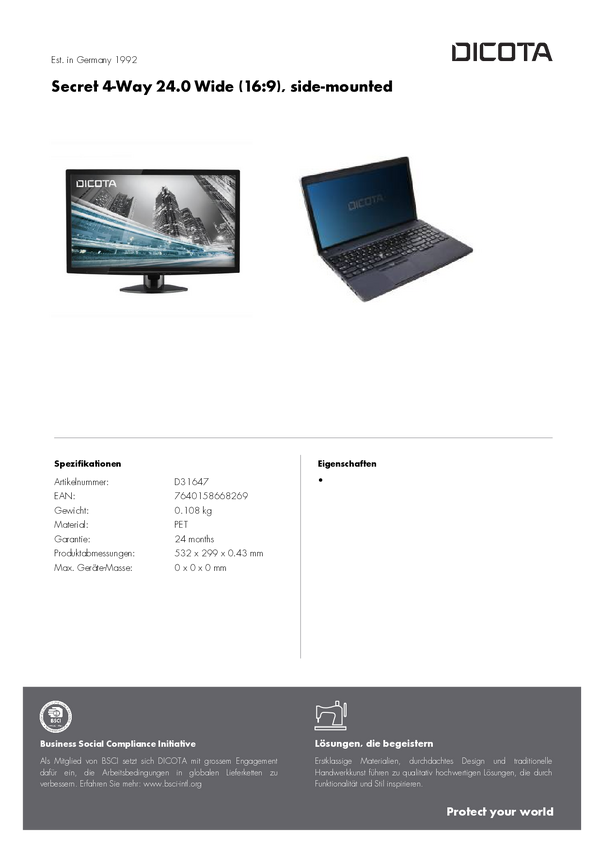 Filtr prywatyzujący Dicota D31647 przeciwodblaskowy osłona ekranu 61 cm (24 cale)