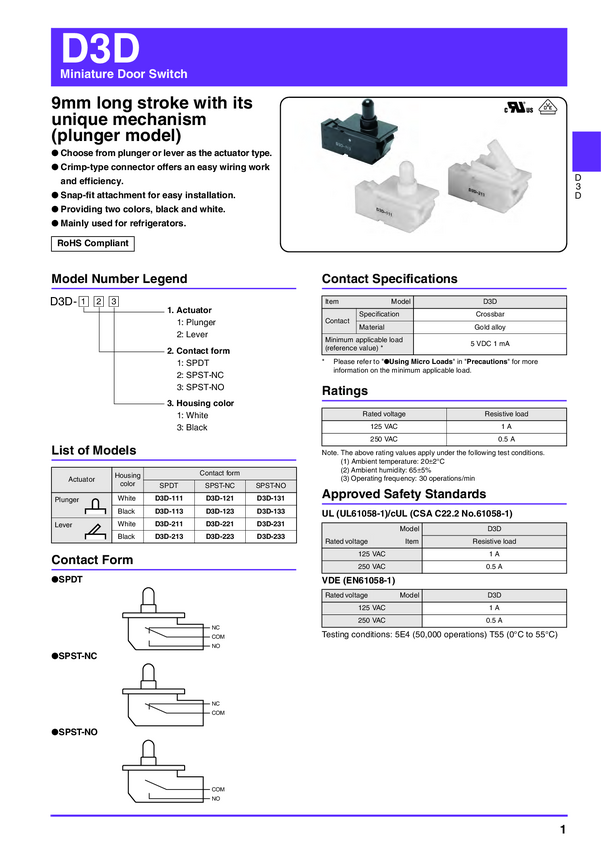 Electromechanical Switch Detect Switch N.O./N.C. SPDT 0.1A