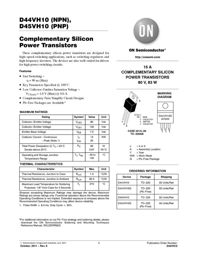 Power Bipolar Transistor, PNP, 10 A, 80 V