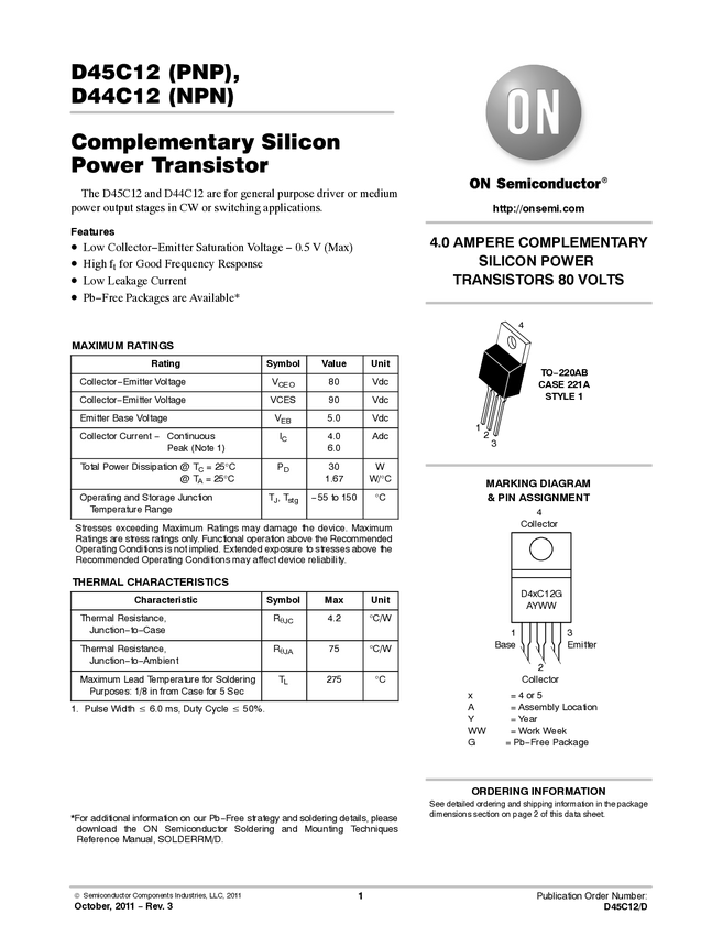 Power Bipolar Transistor, PNP, 4.0 A, 80 V