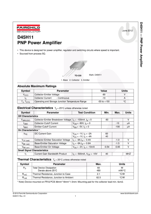 Power Bipolar Transistor, PNP, 10 A, 80 V