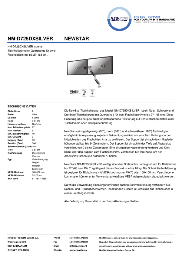 Neomounts NM-D725DXSILVER Uchwyt do monitora, stołowy 25,4 cm (10") - 68,6 cm (27") Obrotowy, Przenośny, Uchylny, z regu