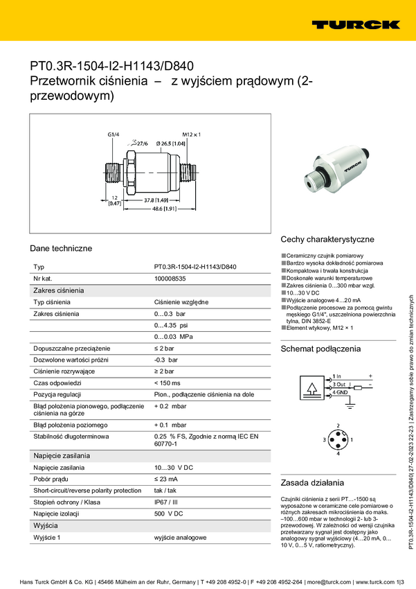 Turck Przetworniki ciśnienia 1 szt. PT0.3V-1503-I2-H1143/D840