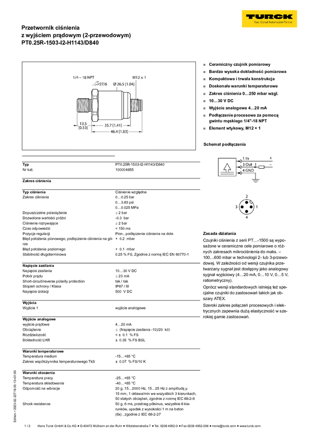 Turck Przetworniki ciśnienia 1 szt. PT0.25R-1503-I2-H1143/D840