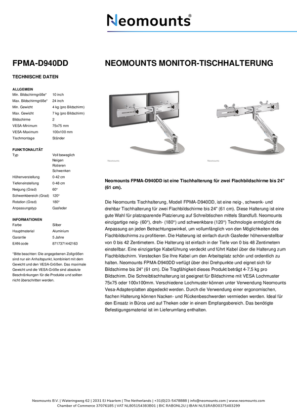 Neomounts Uchwyt do monitora, stojący FPMA-D940DD 2 Wyświetlacz 25,4 cm (10") - 61 cm (24") srebrny Uchylny, Przenośny,