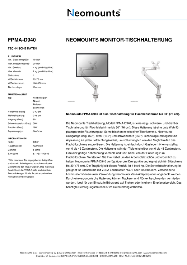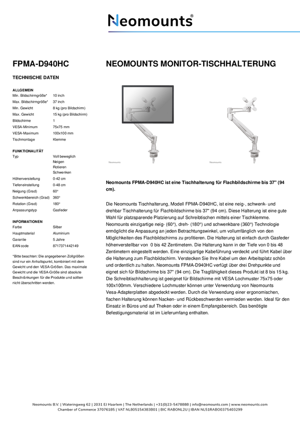 Neomounts Uchwyt do monitora, stołowy FPMA-D940HC 1 Wyświetlacz 25,4 cm (10") - 94,0 cm (37") srebrny z regulowaną wysok