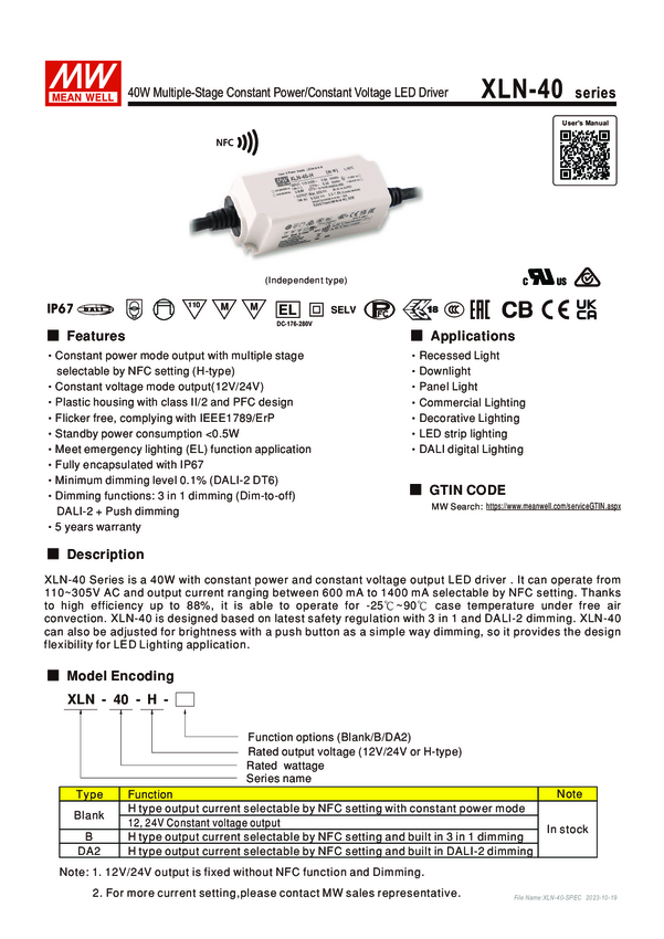 MW Mean Well XLN-40-H-DA2 Sterownik LED 40.0 W 0.6 - 1.4 A 9 - 54 V 1 szt.