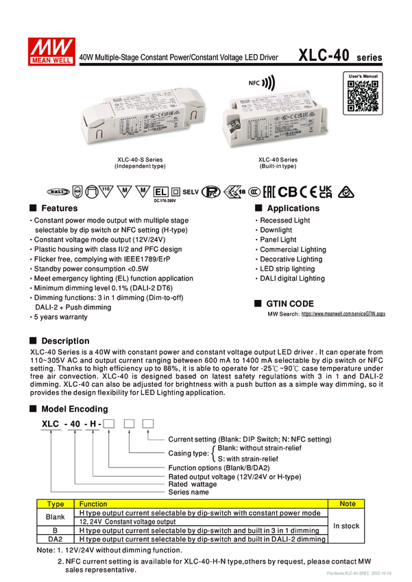 MW Mean Well XLC-40-H-DA2SN Sterownik LED 40.0 W 0.6 - 1.4 A 9 - 54 V 1 szt.