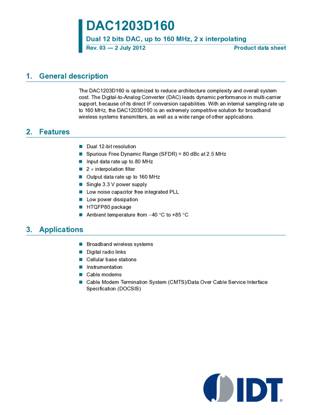 Dual 12 bits DAC, up to 160 MHz, 2 x interpolation