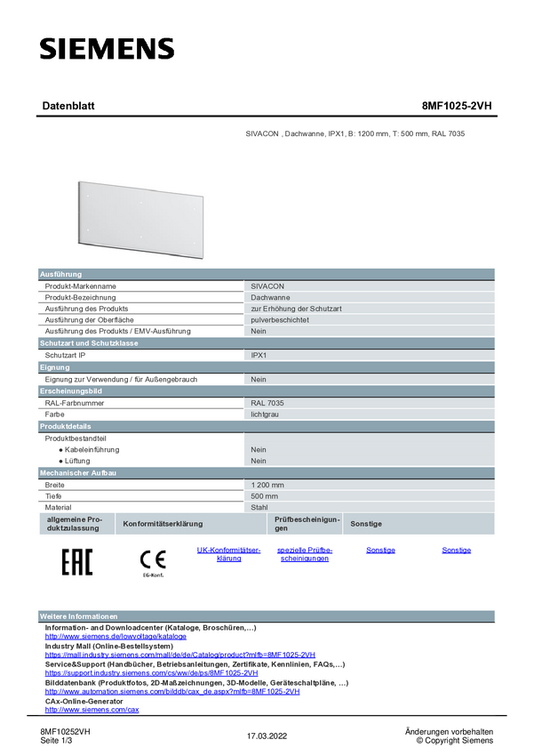 Koryto dachowe Siemens 8MF1025-2VH (D x S) 500 mm x 1200 mm stal 1 szt.