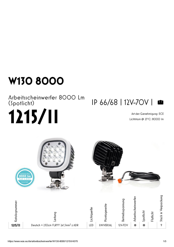 Reflektor dalekosiężny WAS W130 8000 Spot 1215 8000 lm