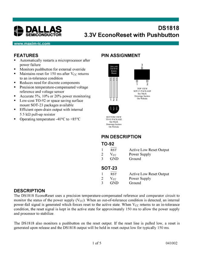 Czujnik temperatury; DS18B20; termometr cyfrowy; -55+125*C; 3-5,5V; TO92; THT; MAXIM-DALLAS; RoHS