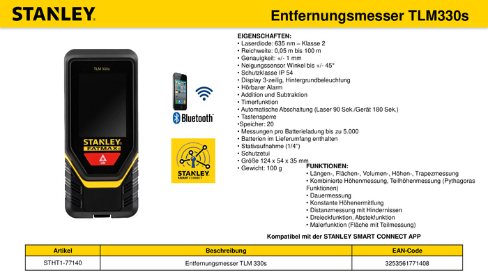 STANLEY TLM330s Dalmierz laserowy Maksymalny pomiar 100 m
